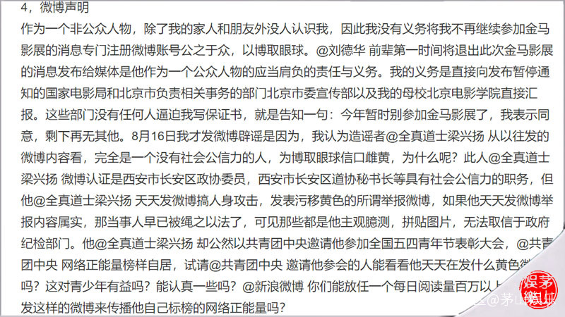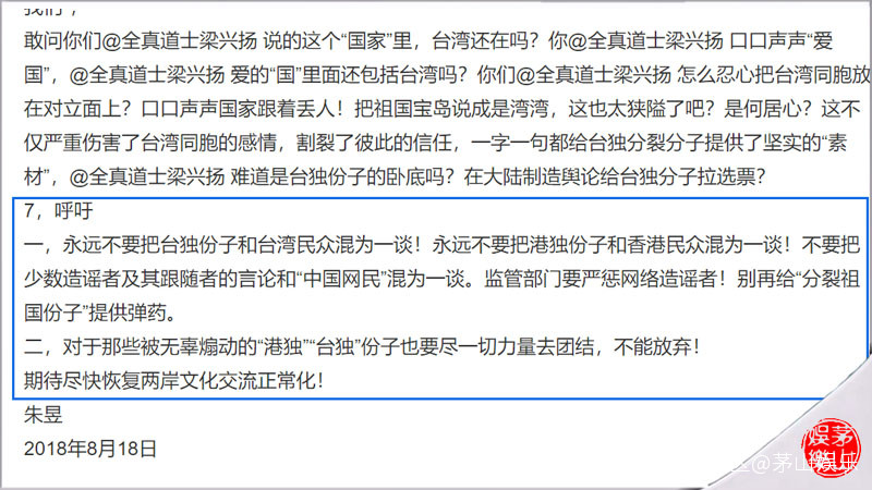 8月15日,多家台媒發通稿稱,大陸紀錄片《少年問道》“仍一本初衷,堅持不退賽。”而上個月底(7月31日),也曾有媒體報道稱,導演朱昱曾公開發願表示:“如《少年問道》幸運提名金馬,她將率演員來台與台灣電影界及道教界進行交流,未來更希望來台拍攝相關題材。”台媒體的大肆造作,頓時讓女導演朱昱成了眾矢之的,引來了無數網友的不滿,這其中有位微博上擁有近200萬粉絲的微博大V全真道士梁興揚。