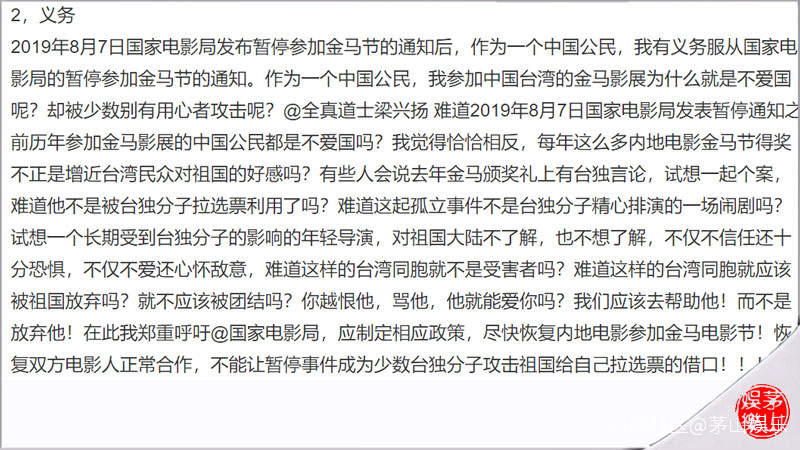 接着,她説“國家電影局發佈暫停參加金馬節的通知後,作為一箇中國公民,我有義務服從國家電影局的暫停參加金馬節的通知。作為一箇中國公民,我參加中國台灣的金馬影展為什麼就是不愛國呢?卻被少數別有用心者攻擊呢?”此外,她“呼籲@國家電影局,應制定相應政策,儘快恢復內地電影參加金馬電影節!恢復雙方電影人正常合作,不能讓暫停事件成為少數台獨分子攻擊祖國給自己拉選票的藉口!!!”