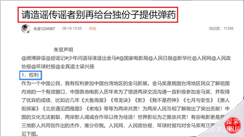 從朱昱的闢謠長文看,她在接到相關部門通知的時候就已經決定不再參加金馬影展了。現在看來,台媒或許為了自己的自尊心,大肆炒作了一把,給外界一個錯覺,令外界覺得金馬獎是個香餑餑。這樣一説,網絡大V“全真道士梁興揚”或許真的是冤枉了朱昱,讓內地的網民在網上打口水仗,看來極有可能是某些別有用心的台媒故意使得陰招,瓜眾也千萬別上當了,儘快讓這件事冷下來。