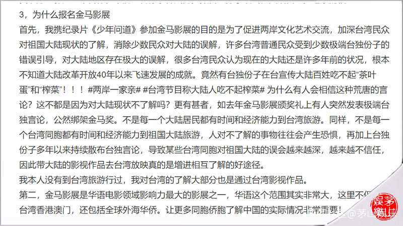 在説到為什麼報名金馬影展時,朱昱説參加金馬影展的目的,一“是為了促進兩岸文化藝術交流,加深台灣民眾對祖國大陸現狀的瞭解,消除少數民眾對大陸的誤解”,二是因為”金馬影展是華語電影領域影響力最大的影展之一,華語這個範圍其實非常大,這裏不僅包括台灣香港澳門,還包括全球外海華僑。讓更多同胞僑胞瞭解中國的實際情況非常重要!“