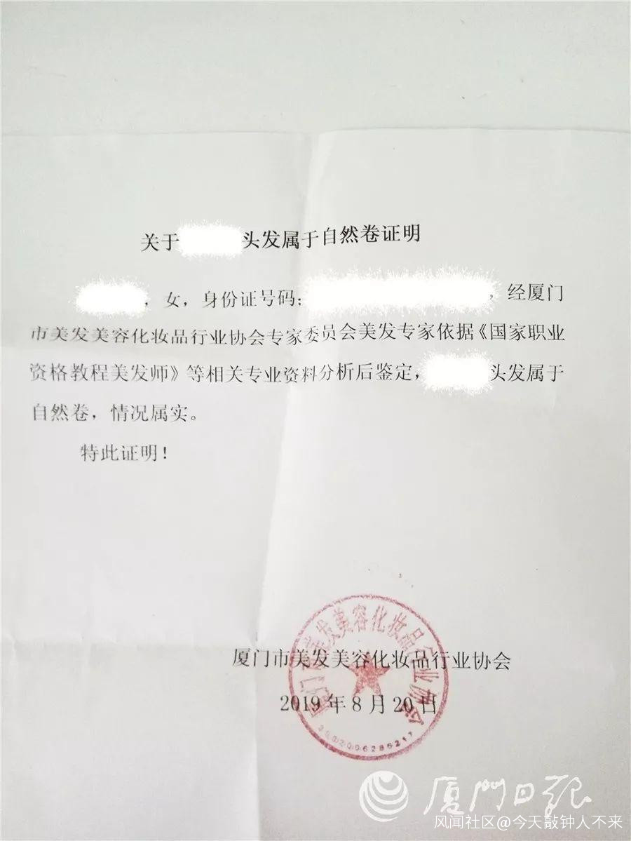 專家委員會的美髮專家經過專業分析後認定,小雯的頭髮屬於自然捲。隨後,協會開具了一張“關於小雯(化名)頭髮屬於自然捲”的證明,並蓋章認證“情況屬實”。