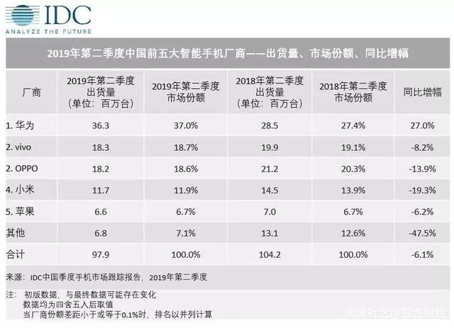 近日,據權威機構IDC統計2019年第二季度中國前五大智能手機廠商出貨量,除華為同期逆勢大增約27.0%之外,其餘四家頭部品牌皆出現不同程度下滑,其中以小米降幅最為顯著。