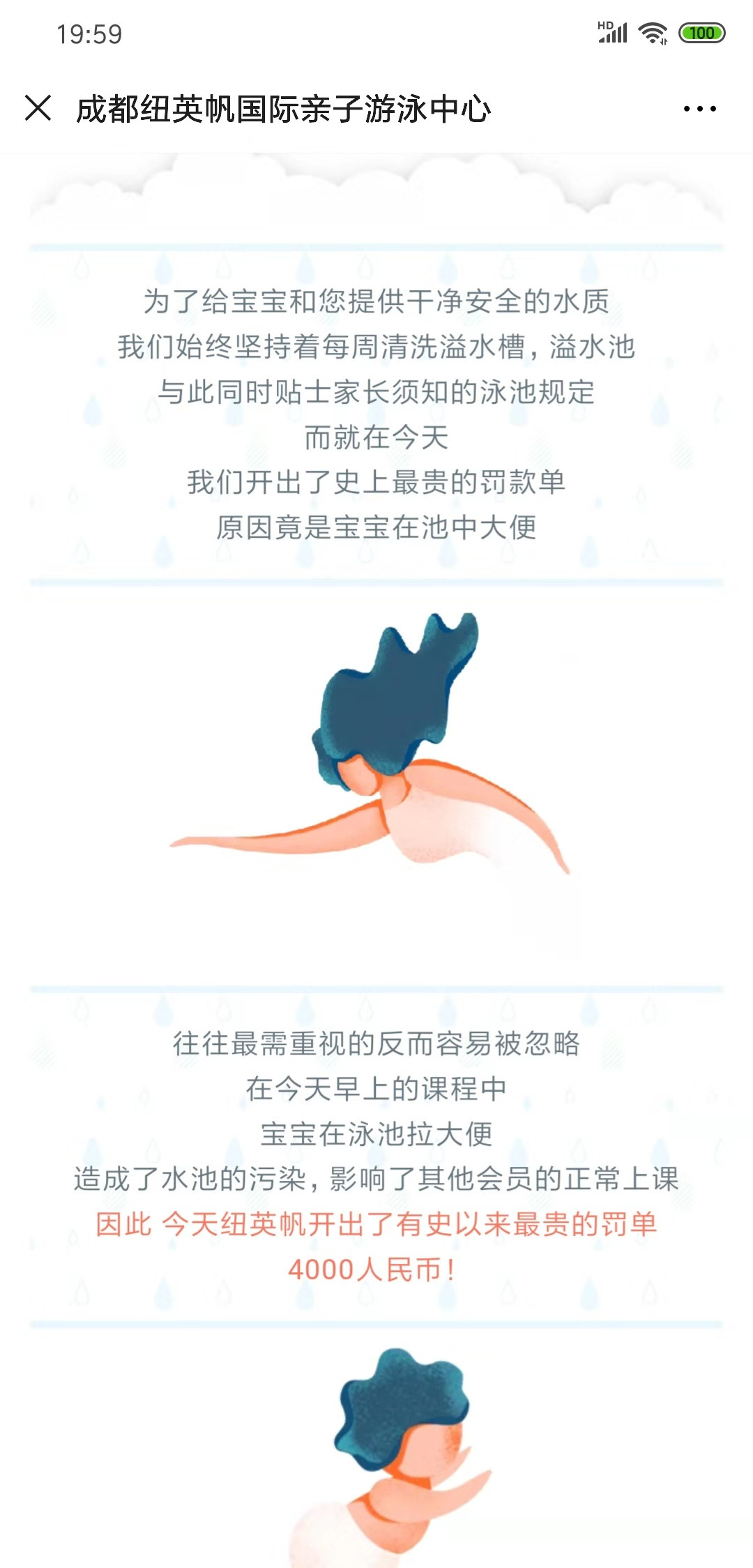 事情發生的當天(18日),成都紐英帆國際親子游泳中心的官方微信公眾號發了一條微信推送,《紐英帆第一個罰單,也希望是最後一個喲》提到,“(成都紐英帆國際親子游泳中心)開出了史上最貴的罰單,原因竟然是寶寶在池中大便”,典典媽媽認為,該推送內容文字雖然沒點名,但意思“很過分”,她認為,小朋友年齡太小,不能控制或者明確表達自己大便的意圖,防水紙尿褲側漏,也不是孩子故意要拉大便在泳池的。