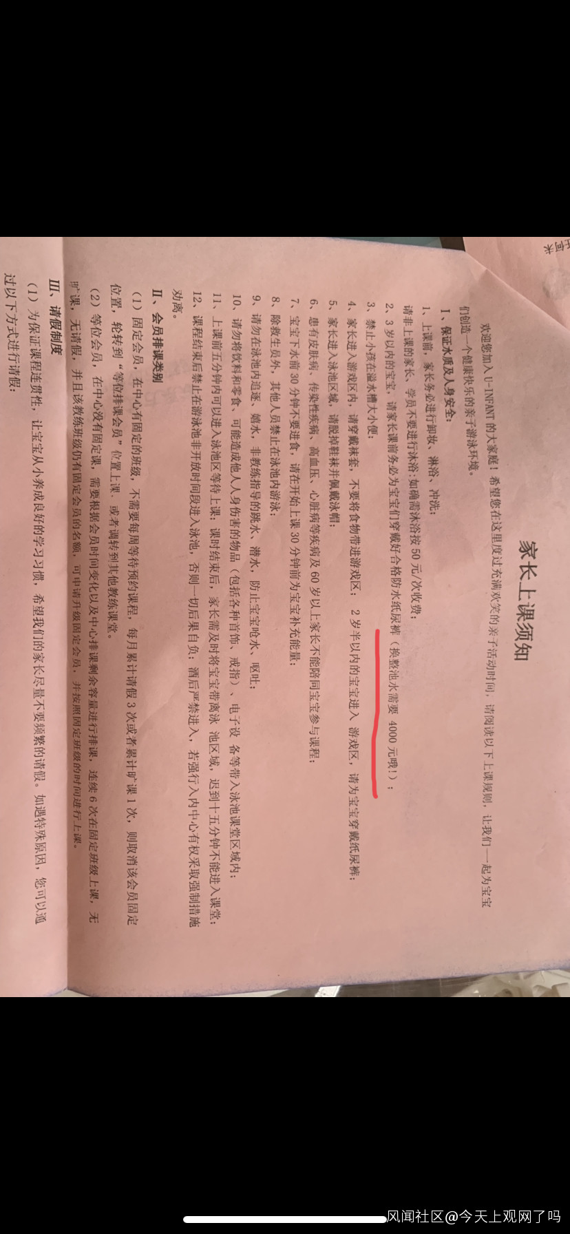 典典媽媽表示,因為已經臨近中午,孩子也餓了,着急回家吃飯,當時並沒有溝通太多,但當自己回家後,諮詢了其他親子游泳中心,有的表示如果發生這樣的情況,不會要求家長賠償,同時,購買課程時,合同裏也沒有約定相關內容,僅在《家長上課須知》中提到“3歲以內的寶寶,請家長課前務必為寶寶們穿戴好合格的防水紙尿褲(換整池水需要4000元哦!)”,並未表示這就是賠償價格。