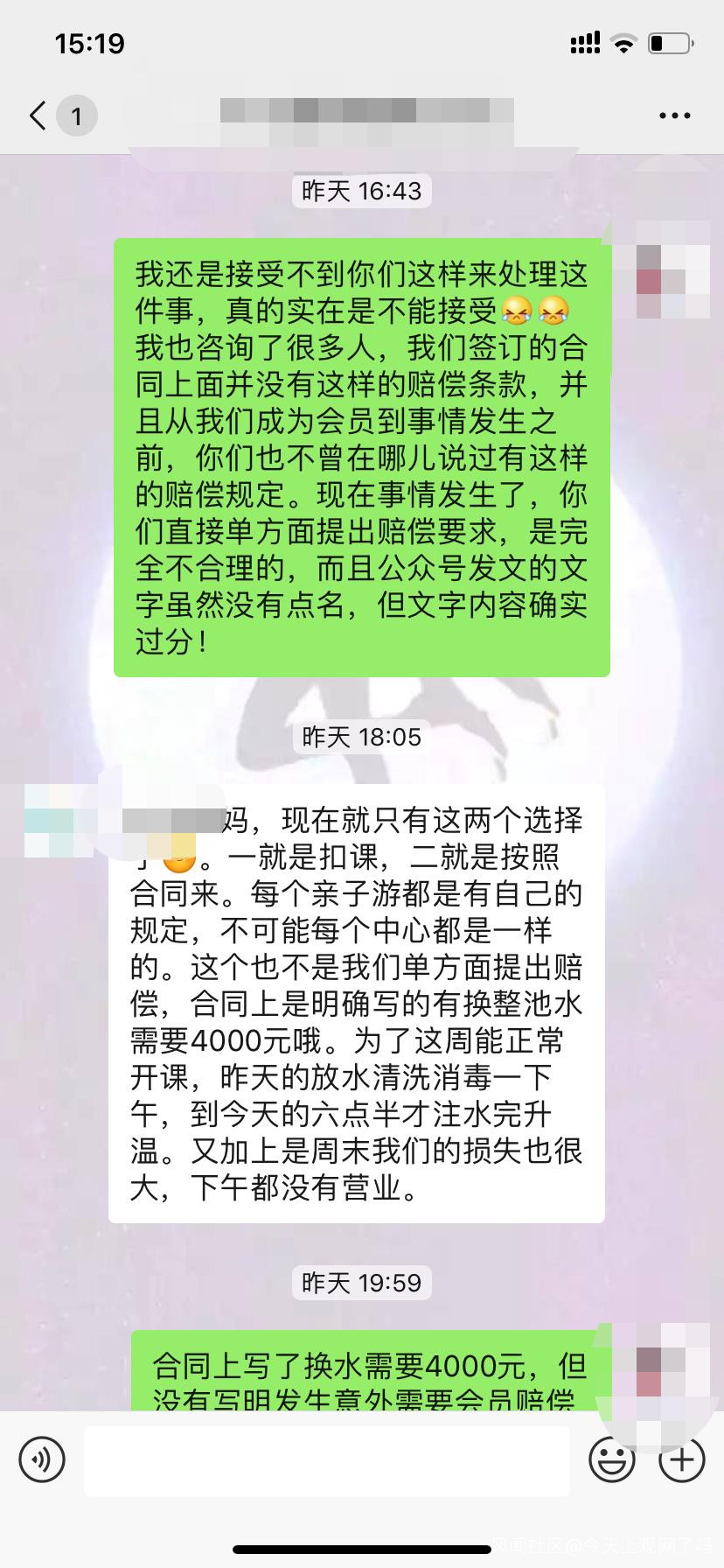 而在19日,典典媽媽與親子游中心工作人員溝通的微信截圖上,紅星新聞記者看到,典典媽媽與工作人員在就賠償問題協商時,工作人員表示,在營業期間確實是因為典典拉粑粑換了整池水,除了按照合同(賠償)外,還可以採取扣除課時費用的方式。典典媽媽表示,孩子還剩下42節課未上,按照購課價格計算,還有6720元。