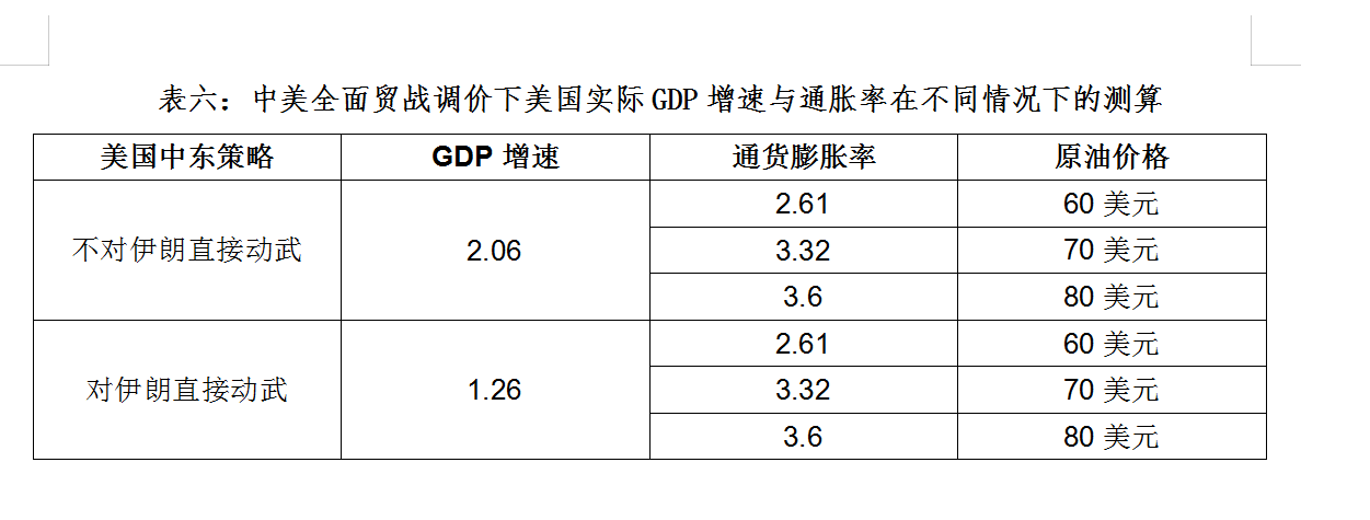 **在中美貿易戰全面開打的前提下,無論美國是否直接進攻伊朗,美國經濟增速都會下降(只不過下降的幅度不同),而油價上漲將推高美國通脹率,美國經濟將在短期內出現實際GDP增速低於通脹率的滯脹現象。**根據2016年-2019年月度原油(WTI)價格及通脹率數據估算,當原油價格在60美元左右時,美國通脹率大約為2.19%,如果原油價格上漲到80美元左右,美國通脹率預計將上升至3.22%(參見表四)。如果美國對華5000億商品全部加徵25%關税,又會使通脹率上升0.42%。在美國對華全面加徵關税且油價上漲到80美元/桶的情況下,美國國內通脹率水平預計將達到3.6%左右。在經濟增速方面,如果美國不直接對伊朗動武,中美貿易戰會使美國實際GDP增速下降0.8%,美國經濟增速會從2018年的2.86%下降到2%左右;如果對伊朗直接動武,雖然打仗會提高美國政府消費支出,但政府消費支出擴大將對個人消費支出形成擠出效應(見表五),兩相抵消,預計將使美國實際GDP增速降低0.8%,再加上中美貿易戰的影響,兩者疊加預計將一共下降1.6%,美國經濟增速會從2018年2.86%的降低至1.26%。總之,無論是武力威懾伊朗還是直接對伊朗動武,油價上漲都將使美國經濟出現實際GDP增速低於通脹率的滯脹(參見表六)。