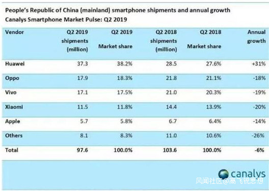 即使曾經牛逼哄哄的蘋果手機iPhone,也在節節敗退,2019年第二季度,市場份額同比下跌6.2%,只剩下6.7%。