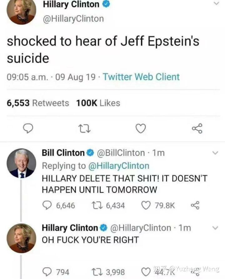 希拉里: 愛潑斯坦自殺了,好震驚! (發於8月9號)