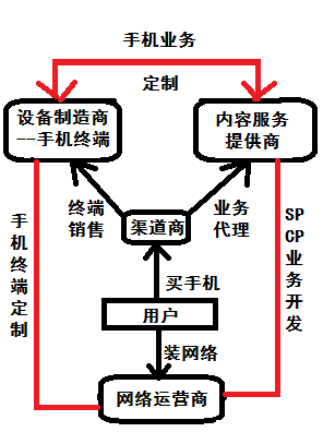 從這張圖上看,1G時代2G時代被打包捆綁的角色,終於得以獨立運營大放異彩:設備製造商與內容提供商平行,為渠道商提供終端銷售與業務代理,而兩者之間又為手機業務定製形成合作關係。而終端定製與SPCP業務開發則是兩者與網絡運營商合作完成。在這個生態中,各部門都有自己的一個專業領域發展,隨着各部分的內容豐富,整個生態圈的發展前景也會越來越好。