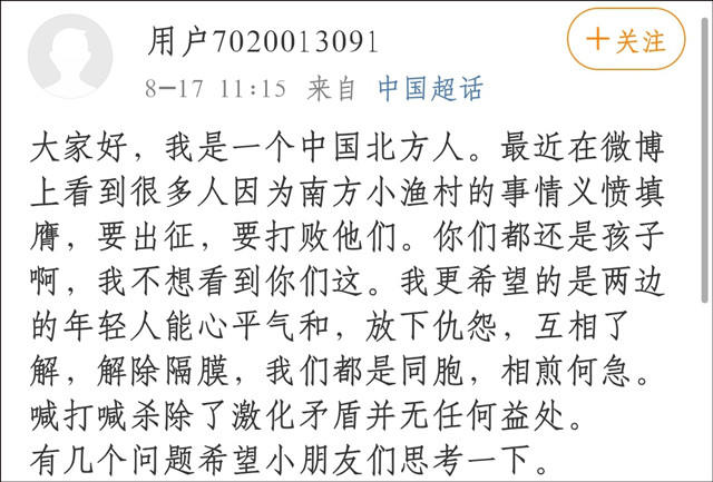 前幾天有一位自稱是“中國北方人”的微博網友@用户7020013091 在“中國超話”內就“帝吧再出徵”一事發表了看法,聲稱不想看到這樣情況發生。