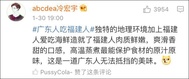 後來網友們紛紛以此作梗,編出各種段子。比如,有網友調侃説“難道是因為獨特的地理環境加上福建人愛吃海鮮造就了福建人肉質鮮嫩,所以福建人就成為廣東人無法抵擋的一道美味?”