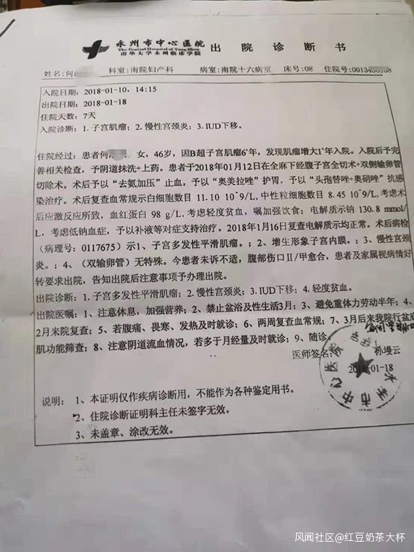 另一份永州市中心醫院的出院診斷書顯示,2018年1月18日,何詠梅由於子宮多發性肌瘤,進行了子宮全切術和雙側輸卵管切除術。