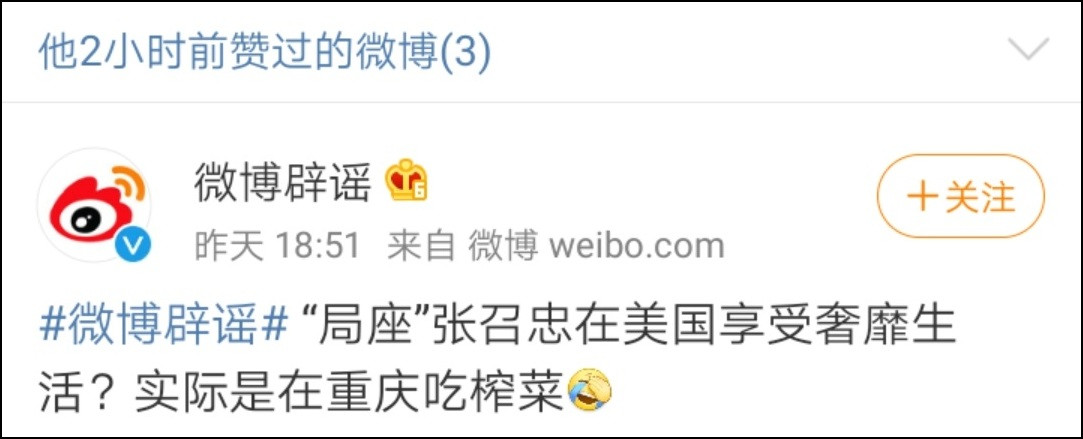 8月23日,張召忠點讚了兩則闢謠微博,似乎也是在表明自己對於造謠者的藐視。