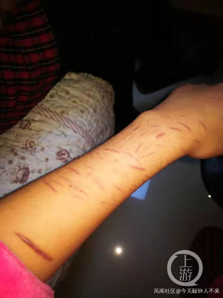 蕭雅的媽媽向上遊新聞記者介紹,1月3日,她發現女兒手臂上被小刀劃出多道傷痕。蕭雅説是自己割的,因為心裏不爽。