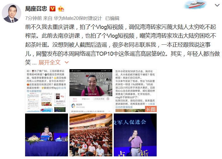 前不久我去重慶講課,拍了個Vlog短視頻,調侃灣灣磚家污衊大陸人太窮吃不起榨菜。此前去南京講課,也拍了個Vlog短視頻,嘲笑灣灣磚家攻擊大陸窮困吃不起茶葉蛋。沒想到被人截圖後造謠,很多老同志聯繫我,一本正經跟我説這事兒,網警發佈的本週網絡謠言TOP10中這條謠言高居第9位。其實,年輕人都當做笑談,沒人相信這種鬼話。我下午在南昌講課,並沒有去那個風景線美好的國家。
