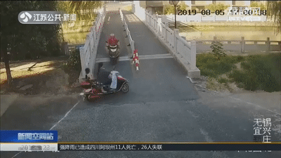 現場民警立刻調看了監控錄像。當時,一名紅衣男子騎着黑色電動車從橋上駛來,在路口與李女士發生碰撞。