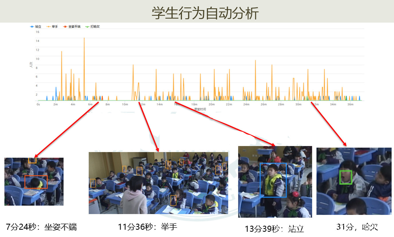 通過採集學生坐姿、舉手、站立、打哈欠等課堂行為,就可以進行學習狀態、課堂有效性、學習興趣等相關性研究。