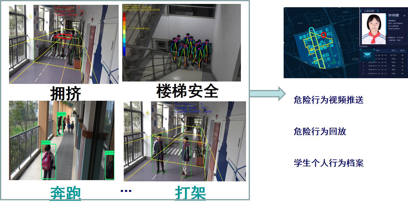 孩子在校園生活中是否有微笑、向老師問好、主動撿垃圾、列隊整齊等良好行為,或者快速奔跑、摔跤、打架、擁擠等危險動作,都可能被人工智能捕捉識別到。