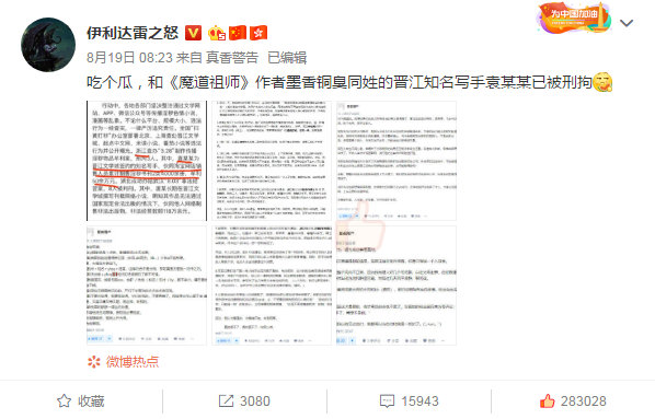網傳《魔道祖師》作者墨香銅臭被刑拘?大快人心!_風聞