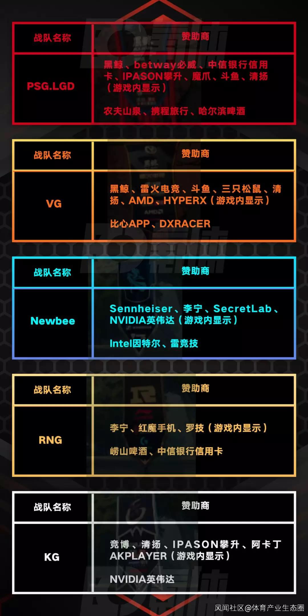 由於無法直接進行官方贊助,不能進行全面覆蓋,很多品牌都選擇了「廣撒網」的方式,贊助多傢俱樂部:如清揚贊助了PSG.LGD、VG和KG三家電競俱樂部,黑鯨則拿下了VG和LGD,李寧贊助RNG和Newbee,中信銀行信用卡選擇了LGD和RNG。