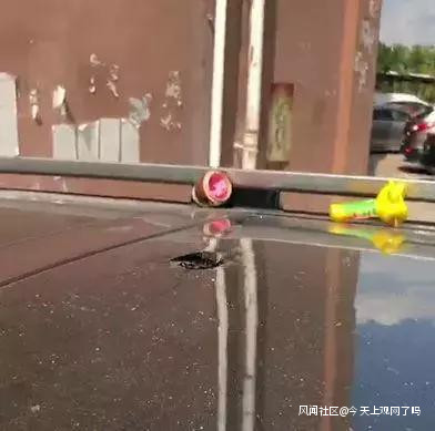 這段視頻是吳先生從目擊者手中得到的,只見不斷有物品從樓上墜下,正好砸中了吳先生的車。