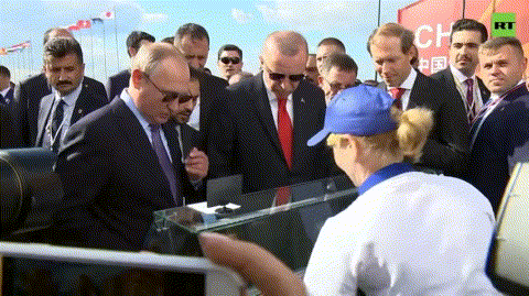 據報道,航展上,埃爾多安在普京以及俄羅斯工業貿易部長曼圖羅夫的陪同下,一同登上梯子,參觀了蘇-57的駕駛艙,並聽取工作人員講解。