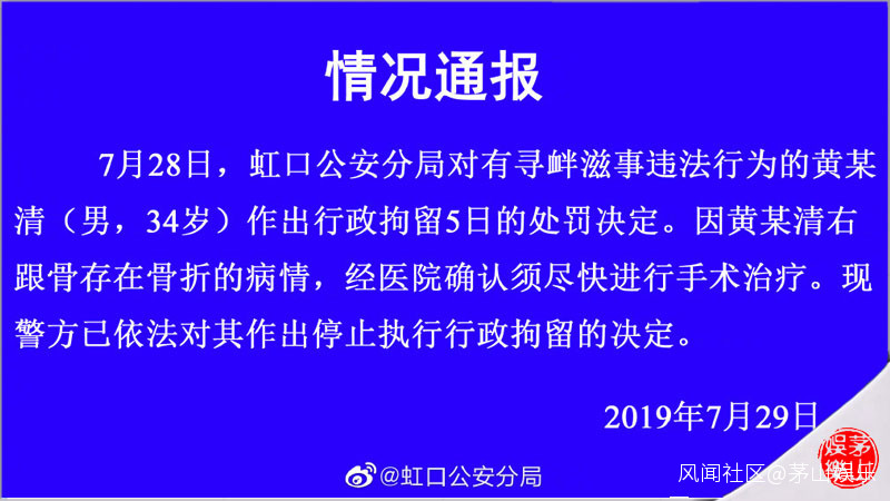 資料圖而在“碰瓷”其它明星期間,黃毅清可是一直沒有忘記周立波,尤其是今年6月周立波從美國回來後,二人在網上撕得相當厲害。而這中間,黃毅清可以爆了不少周立波與前妻、以及他妻子的“黑料”,甚至還曬出了相關的“證據”,更離譜的是,他還造謠上海經偵民警充當周立波“保護傘”等,這樣他終於惹上了官司,於7月28日被上海虹口公安分局拘留,後因有傷被暫停執行。