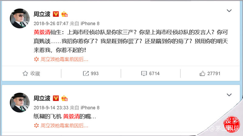 資料圖而到了2018年9月份左右,不知道因何,他又參與到周立波、唐爽的口水仗之中,並直接站隊唐爽這邊。從周立波微博大致可以查到,他和黃毅清二人的口水仗大概始於2018年9月份,他先是在9月14號時發文稱“紙糊的飛機,黃毅清的嘴……”,26號時他又怒罵黃毅清,這次還使用了不太文明的字眼,比如“我是踩到你Dan了?還是踹到你的Ju了?”從此之後,黃毅清“碰瓷”周立波成功,直到他被抓,二人間的口水仗幾乎沒停過。