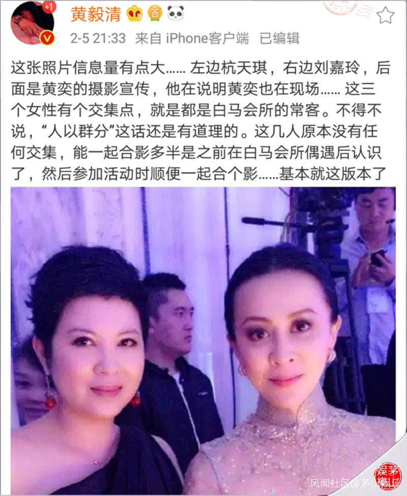 資料圖而黃毅清並沒有放手,而是加大的打擊面,稱當天來他家餐廳吃霸王餐的一羣人裏,還有國家一級演員張國慶。除夕當天,張國慶在微博回應稱:“本人與黃姓人士素不相識,無恩無仇,更不識杭姓藝人!”到了5日(正月初王)晚9點33分又發博並曬出了一張照片,並配文稱“這張照片信息量有點大……左邊杭天琪,右邊劉嘉玲,後面是黃奕的攝影宣傳,他在説明黃奕也在現場”,還表示這三個女性有個交集點,就是都是某個會所的常客。