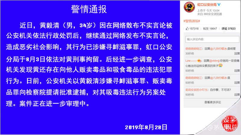 資料圖8月28日,虹口公安分局通過官博發佈了一條警情通報,稱“黃毅清因在網絡散佈不實言論被公安機關依法行政處罰後,繼續通過網絡發佈不實言論,造成惡劣社會影響,其行為已涉嫌尋釁滋事罪,虹口公安分局於8月3日依法對黃刑事拘留。後經進一步調查,公安機關發現黃還存在向他人販賣毒品和吸食毒品的違法犯罪行為。日前,公安機關以黃毅清涉嫌尋釁滋事罪、販賣毒品罪向檢察院提請批准逮捕,對其吸毒違法行為另案處理。”