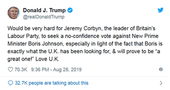 特朗普在推特上稱:“對英國工黨領袖傑里米•科爾賓來説,要想對新首相鮑里斯•約翰遜發起不信任投票將是非常困難的,尤其是考慮到約翰遜正是英國一直在尋找的人這一事實,而且他將被證明是‘一個偉大的人!’愛英國。”