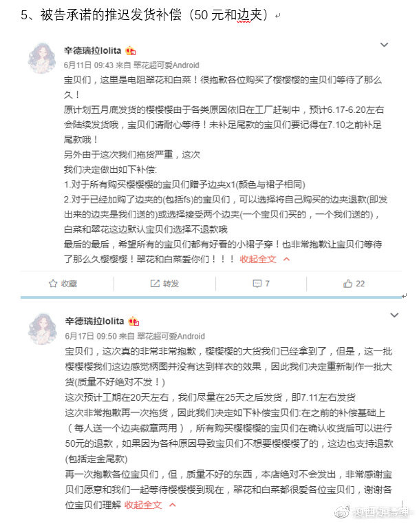 開店的是一位是21歲男生(白菜),店主是18歲女生(翠花),大概是用自己名字幫女朋友開的店吧,可惜寫誰的名字就告的誰。法院通知店家被告後,翠花在店羣裏吐槽我,惹得一眾店家的迷妹在底下噴我,罵我罵得多難聽我就不説了,還有説我是碰瓷的,並給她出曝光我的地址之類的主意。翠花還説櫻櫻櫻虧了 6 萬,現在要低價賣瑕疵款,即預約時等了很久賣 300元甚至300+的裙子現在現貨不用等,而且只要200元。