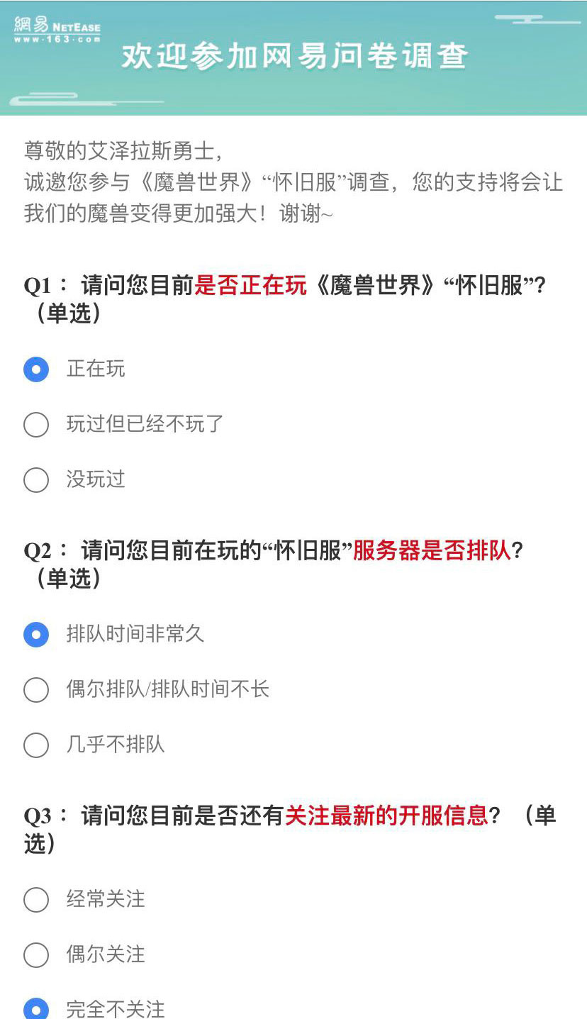於是在過去這幾天時間裏,只要社交羣組裏有《魔獸世界》的玩家聚集,幾乎都會出現各種各樣關於排隊的討論。甚至連網易都看不下去了,還專門發了問卷調查來收集玩家排隊的情況。