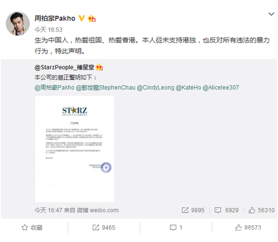 26日,一條“#周柏豪聲明#”的話題迅速佔據微博熱搜第一位。當天下午4時53分,周柏豪在其官方微博@周柏豪Pakho發佈的一段聲明,澄清自己從未支持港獨。