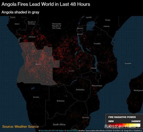據Weather Source網站記錄,安哥拉上週在兩日內發生的火災數量約為巴西的三倍。安哥拉8月25日共有6902起火災登記在案,其鄰國剛果民主共和國則有3395起,而巴西發生火災2127起。在過去的48小時內,贊比亞在發生火災最多的國家排名中位列第四,巴西鄰國玻利維亞則位居第六。