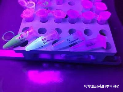 3 取一點沒有雜質的溶液放到玻璃瓶裏,用紫外線(驗鈔燈)照射溶液,不出意外可以看到綠色的熒光。
