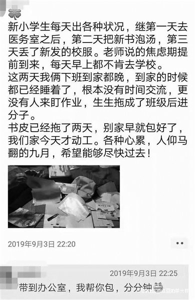 “新小學生每天出各種狀況,繼第一天去醫務室之後,第二天把新書泡湯,第三天丟了新發的校服。老師説的焦慮期提前到來,每天早上都不肯去學校。”朋友圈裏一位吳媽媽深夜吐槽。