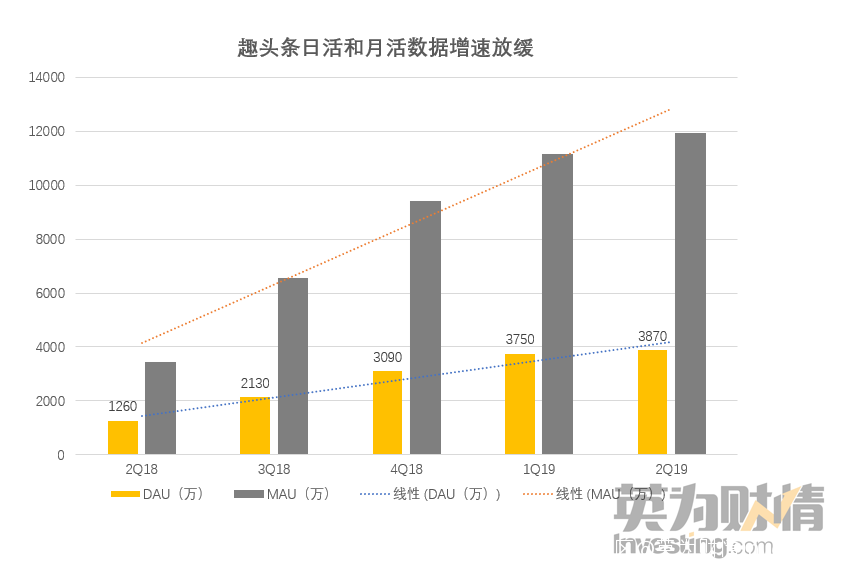 數據顯示,趣頭條平台月活躍用户同比增長250%,至1.193億,同比增長250.2%;而日活躍用户總數同比增長207%,至3870萬,但是,環比來看,二季度僅比一季度的3750萬增加120萬。