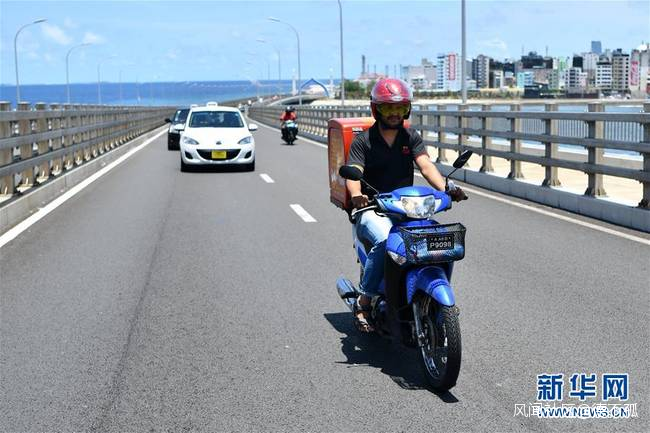 9月1日,快遞員加汗吉爾駛過馬爾代夫中馬友誼大橋為客户送餐。新華社發