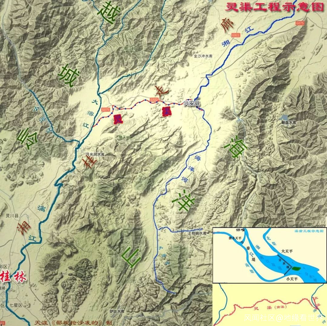 事實的確如此,海洋河所指向的湘桂通道,在中國地緣史上曾經發揮着無可替代的作用。這一作用是通過一條叫作“靈渠”的水利工程具體體現出來。至於靈渠的具體功用,簡單點説就是連通珠江與長江水系。類似的工程大家並不陌生,典型的如在兗州部分解讀的:連通河、濟、淮三水的“鴻溝”工程;及連通江、淮兩水的“邗溝”工程。