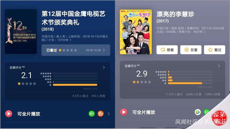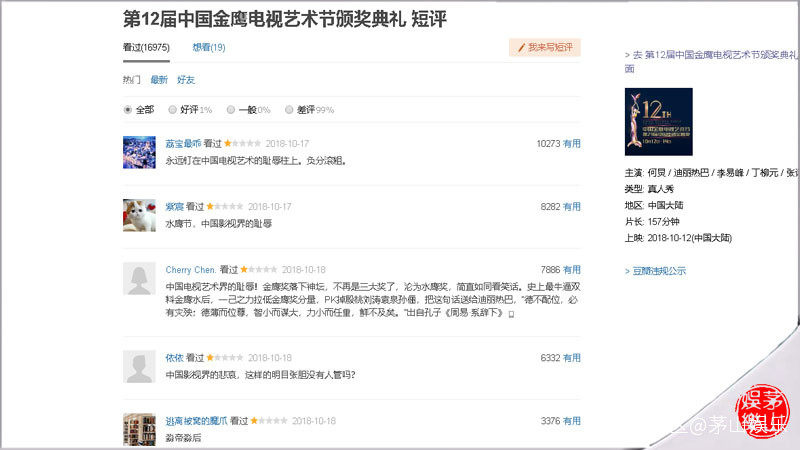 其中在為12屆中國金鷹電視藝術節打分的網友裏,有4.0824萬人給出了1星也即2分,最終形成了2.1分的現狀;而在為《漂亮的李慧珍》打分的網友裏,給出2分的網友有12.0276萬。