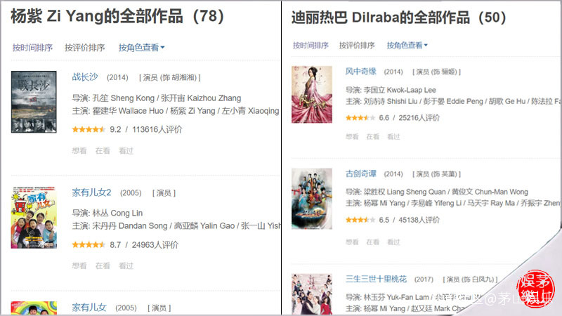 資料圖 為何兩人的近況會有如此大的差別呢?其實,説起原因也不難理解,二人雖然是同歲,但10歲就開始演戲的楊紫已經有17年的演藝經歷,從參演的第一部《孝莊秘史》,到《家有兒女》,再到《戰長沙》,她演過的作品很多口碑都還不錯的,豆瓣上8分以上作品有9部,其中《戰長沙》有9.4分。而迪麗熱巴口碑最好的作品也才6.6分,就演技而言,她與楊紫差的不是一點點。