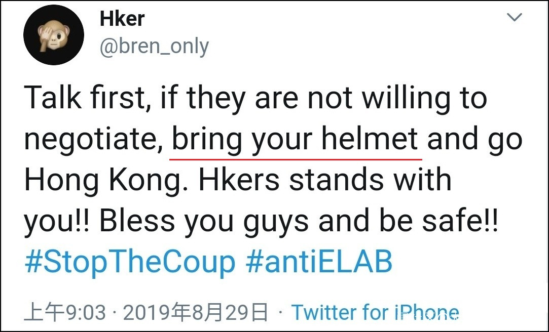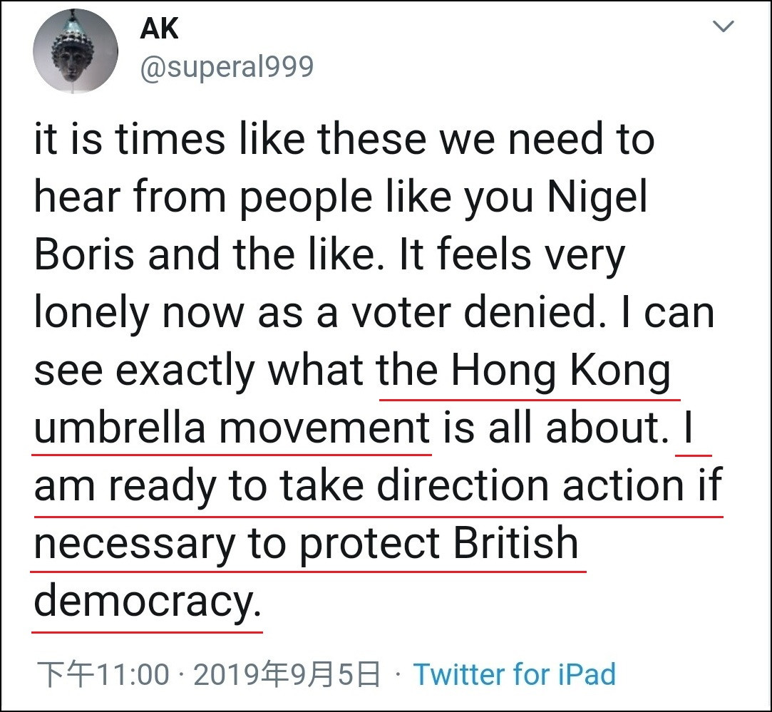 可以注意到,在此期間,推特上就有不少的英國網民發文稱,如果鮑里斯一意孤行的話,他們也將學習香港街頭的遊行示威,以激進方式,帶上雨傘和頭盔等工具逼迫政府做出讓步。