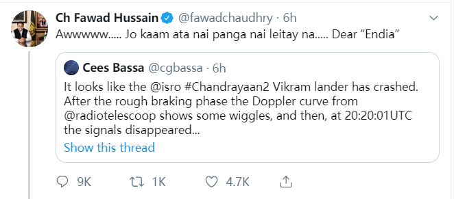 就連巴基斯坦的科技部長法瓦德∙喬杜裏,也親自上陣諷刺印度説:呵呵……..沒能成功啊,親愛的印度……