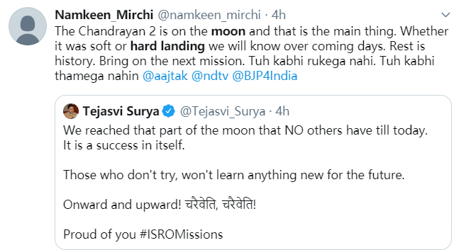 而印度方面的網民也在給他們的科學家鼓勁,表示失敗是成功之母,印度一定會登月成功, 併為印度的科學家感到驕傲。