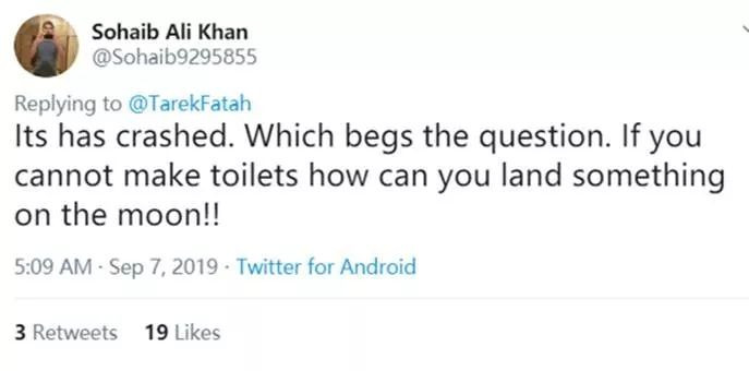 比如下面這位巴基斯坦網民就用印度的“廁所危機”諷刺説:“印度的登月器墜毀了,那麼問題就來了,一個連廁所都修不好的國家,又怎麼能登上月球呢!”