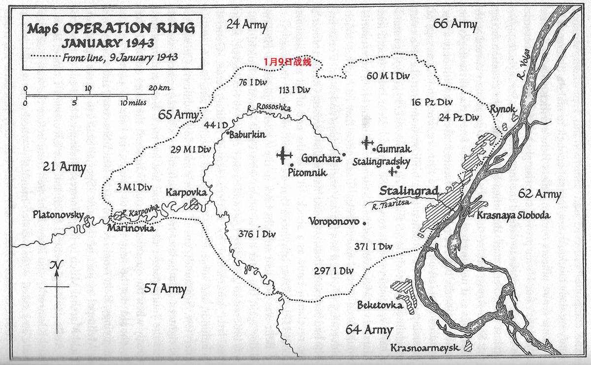 圖9:圖中央黑色飛機標誌即為皮託姆尼克機場(Pitomnik)、古姆拉克(Gumrak)機場和斯大林格勒斯基機場(Stalingradsky)。雖然此圖顯示的是包圍圈1943年1月9日的態勢,但機場位置沒有變化。來源:A.Beevor。