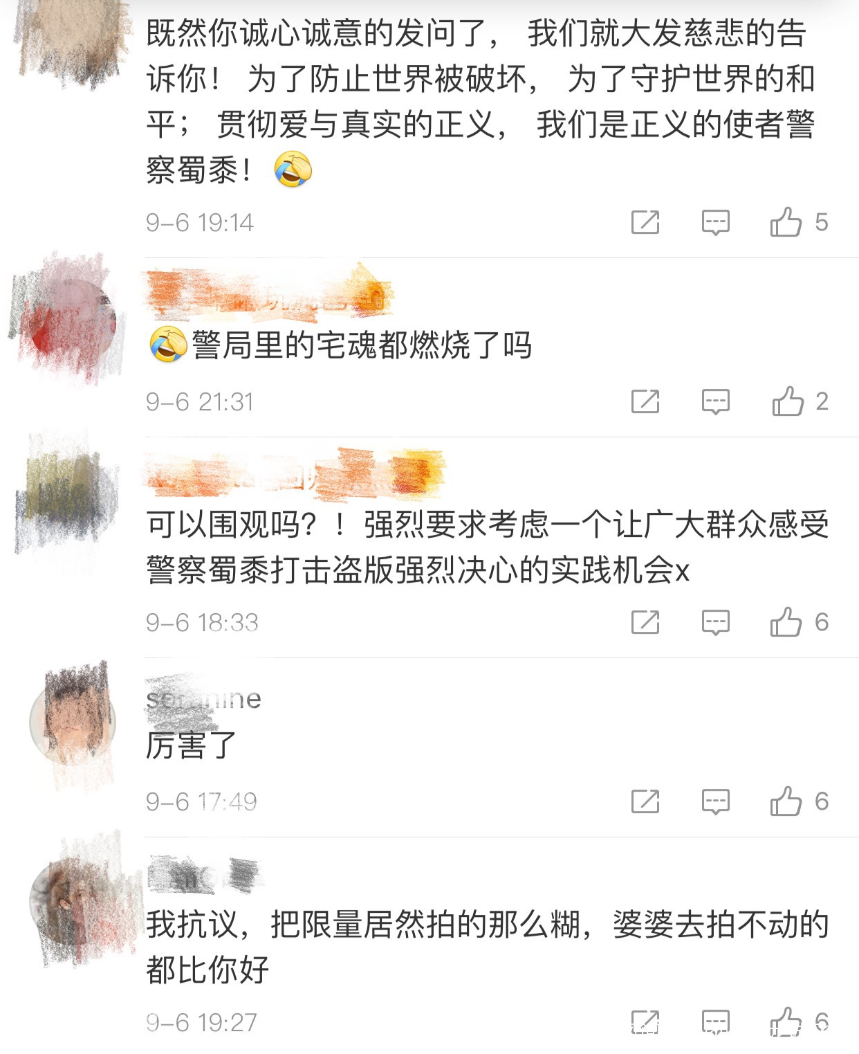 在這條警方發佈的微博下,各“友局”也紛紛前來“吃檸檬”:有“江寧公安在線”請求組織全國巡迴展出擴大學習交流,有“江蘇網警”詢問是否有轉發抽獎活動,上海警方“傲嬌”地表示只能考慮一下組織警營開放日。