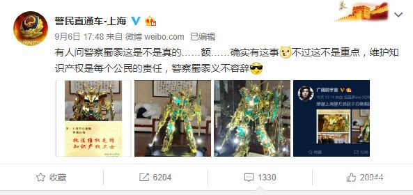 9月6日,上海電視台新聞綜合頻道《案件聚焦》節目在其官方抖音號上發佈了一則視頻新聞:為感謝警方打掉製假團伙,日本萬代南夢宮公司向上海市公安局黃浦分局贈送了一座金色限量“獨角獸”高達。