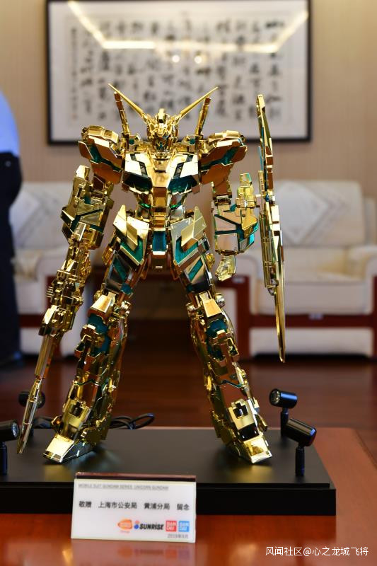 據國內遊戲媒體3DM遊戲網報道,萬代南夢宮贈送給上海警方的這款限量版“獨角獸”高達模型名為“電鍍金色覺醒PG獨角獸”,是高達限量款。